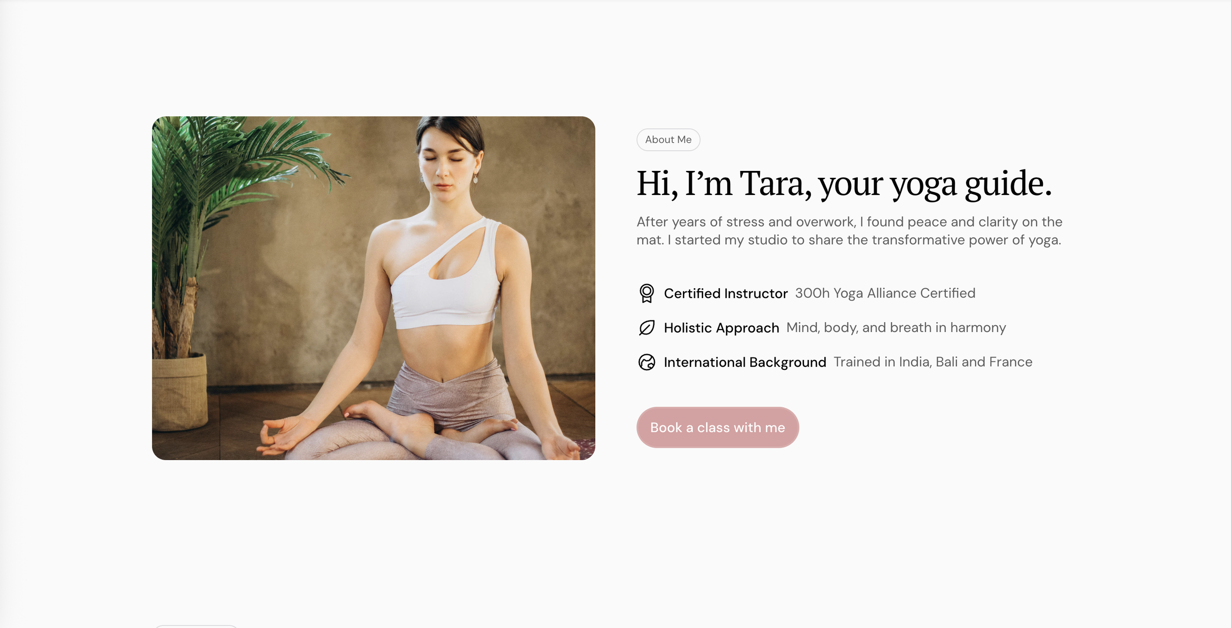 At the heart of any wellness journey is the instructor. This section presents the lead teacher with a warm, approachable profile, blending professional photography with a concise bio. The design emphasises trust and connection, helping potential clients feel at ease and inspired to join.